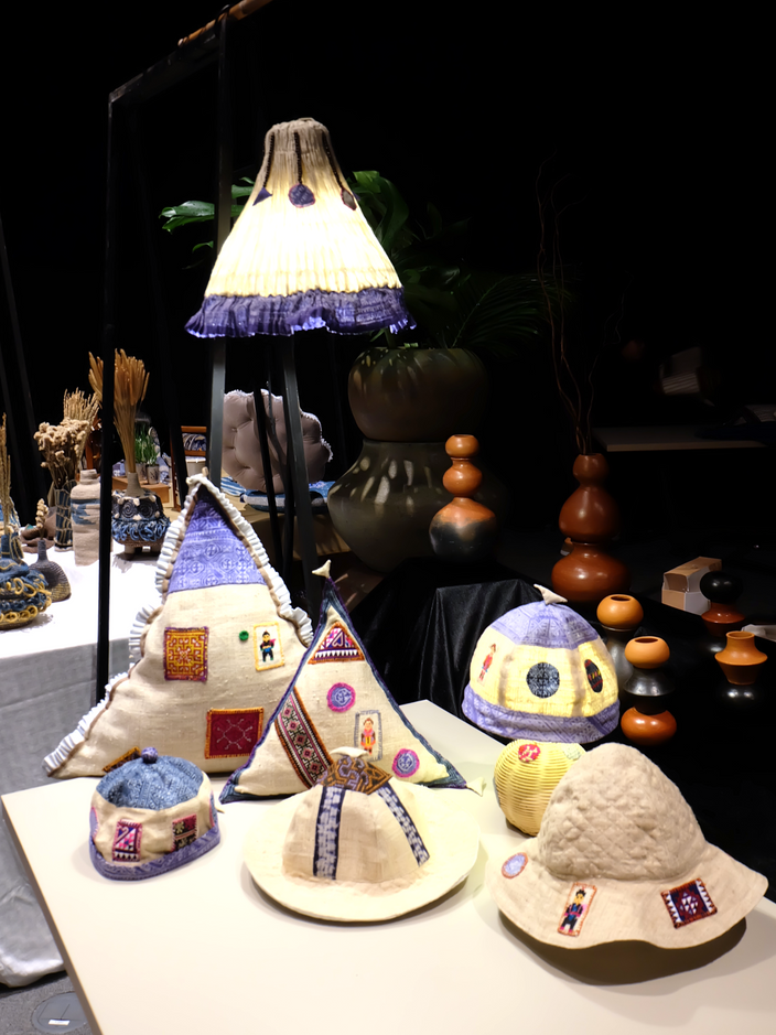The collection is inspired by the traditional festival of Luk Chuang, in which Hmong people throw a ball to each other as a sign of friendship and affection. The concept of new products "Luk Chuang Collection" is for those who are close to the heart. Luk Chuang Collection consists of three products: hemp hat, pillow, and lampshade. Hemp fabric is effective in blocking UV rays and preventing allergies, so we developed a UV-resistant hat. Pillow was made of a hemp core for preventing allergies. The patchwork lampshades were made from scraps of indigo-dyed batik cloth. Each product was embroidered with playful Hmong characters to convey their warmth.